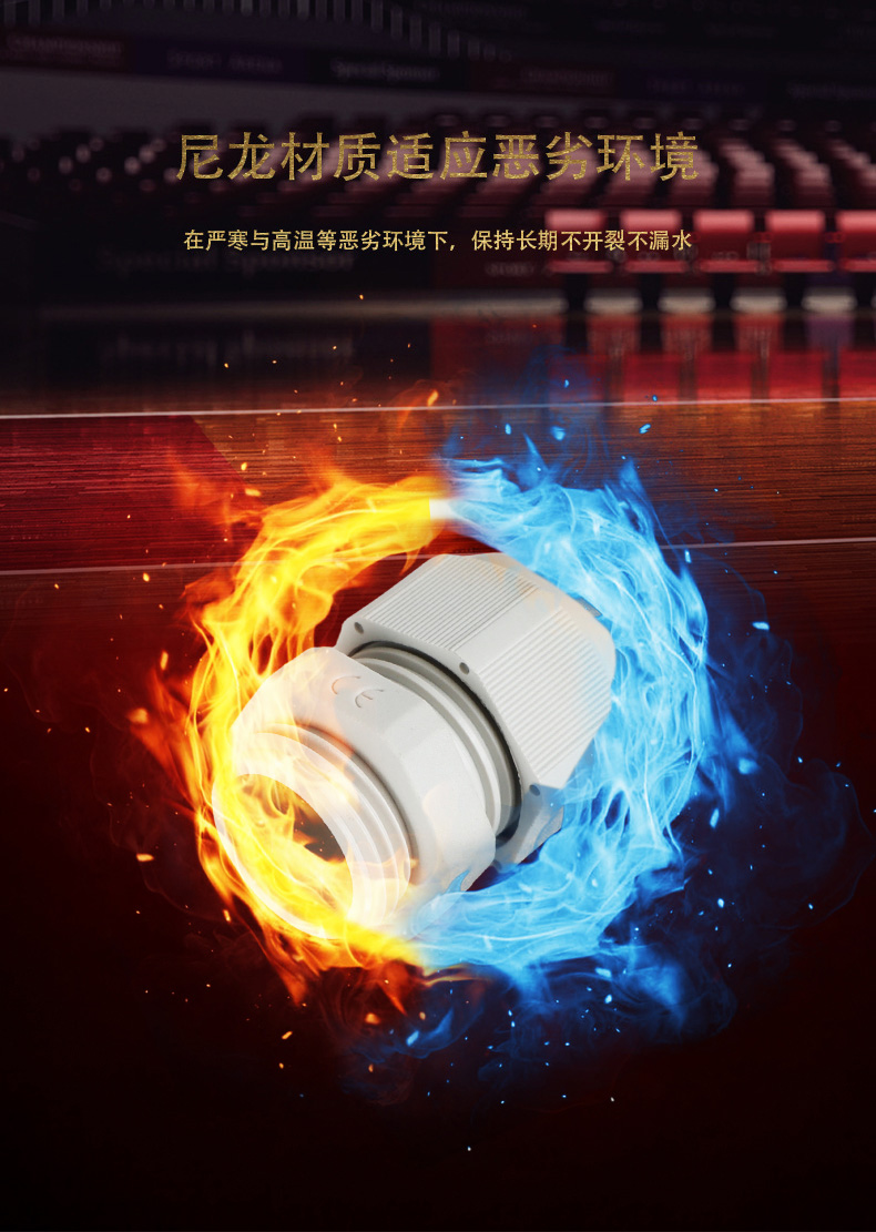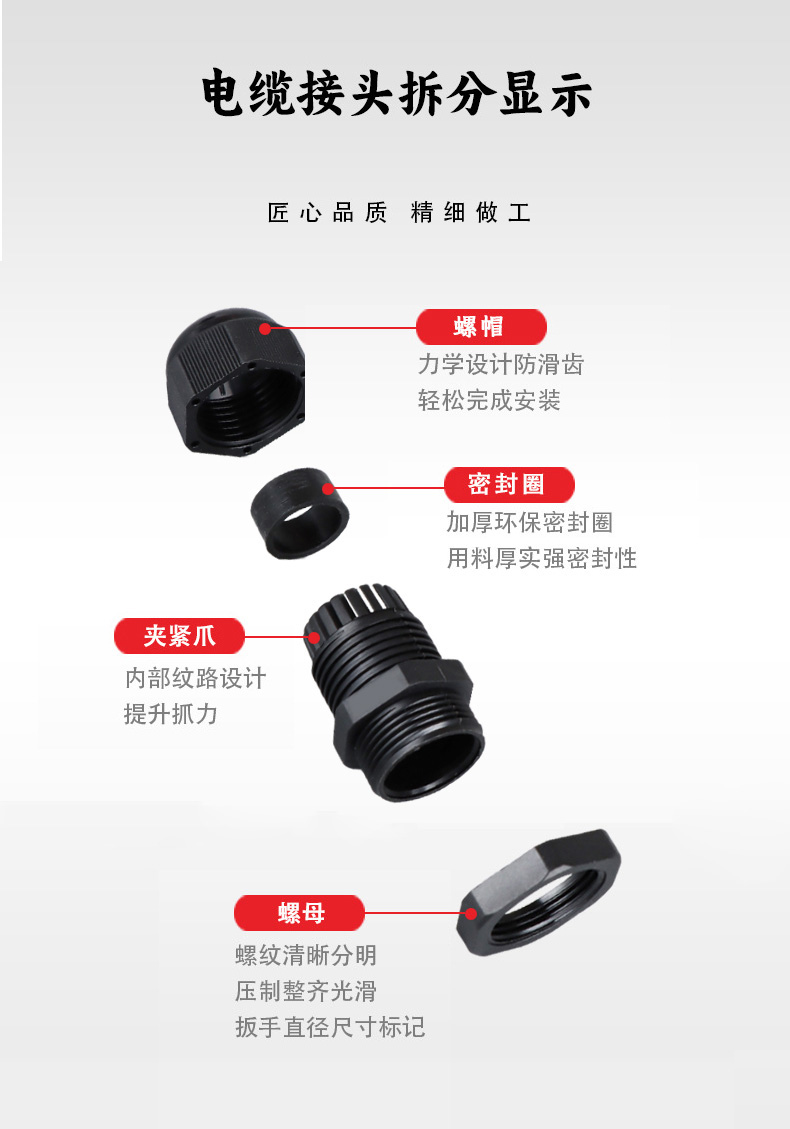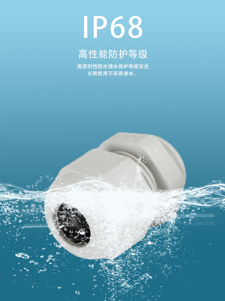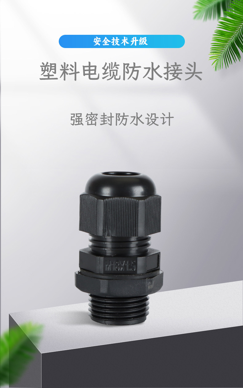 尼龍材質(zhì)適用惡劣環(huán)境紅、灰、黑、深灰、白、藍 六種顏色常規(guī):黑、灰兩種顏色,其它顏色需要定做在嚴寒與高溫等惡劣環(huán)境下,保持長期不開裂不漏水高密封性防水接頭保護電纜安全,長期使用不容易滲水