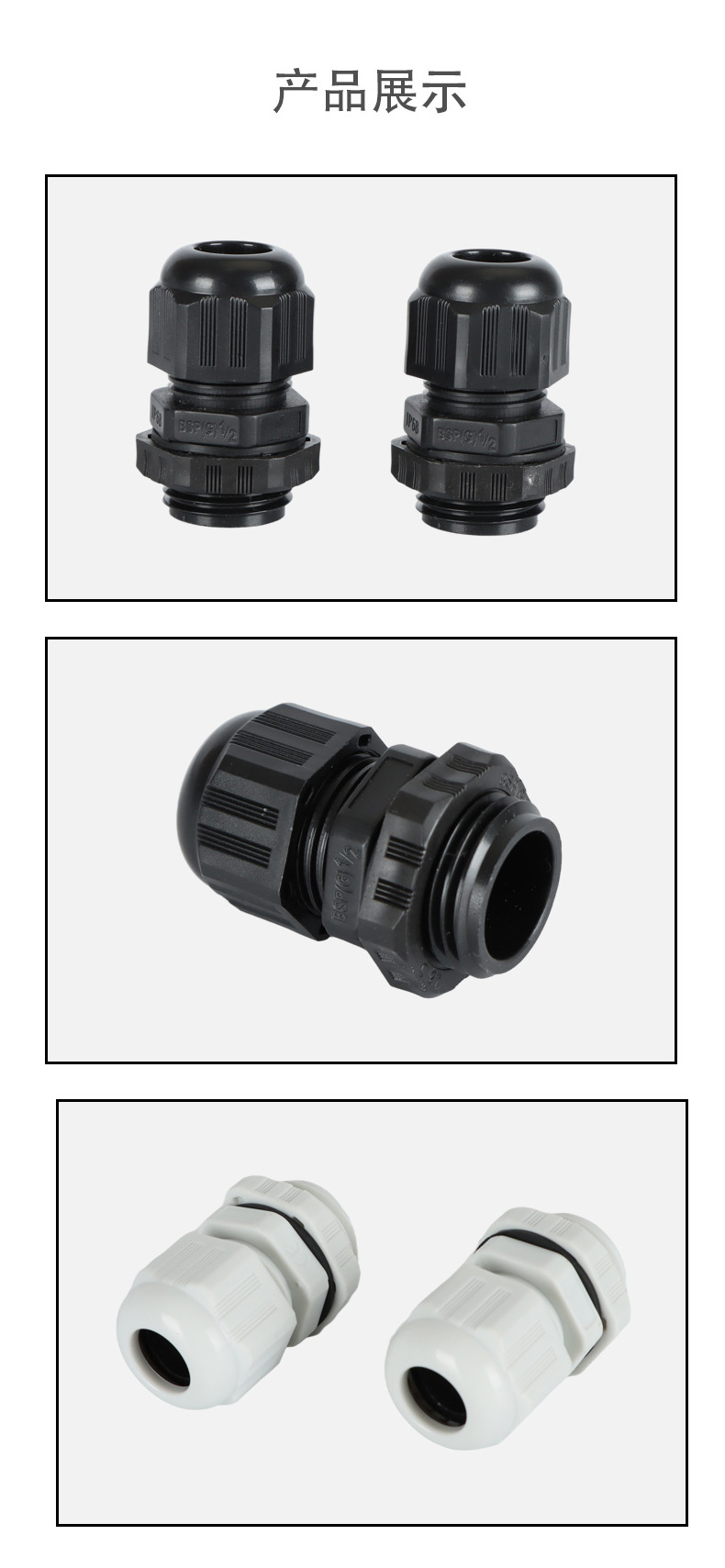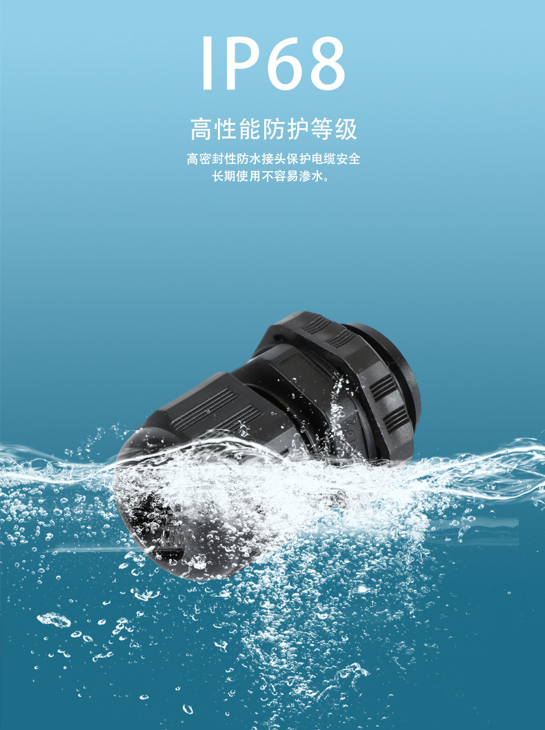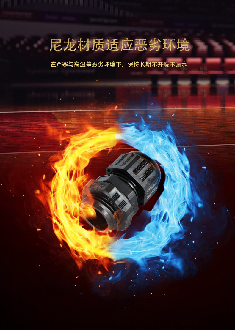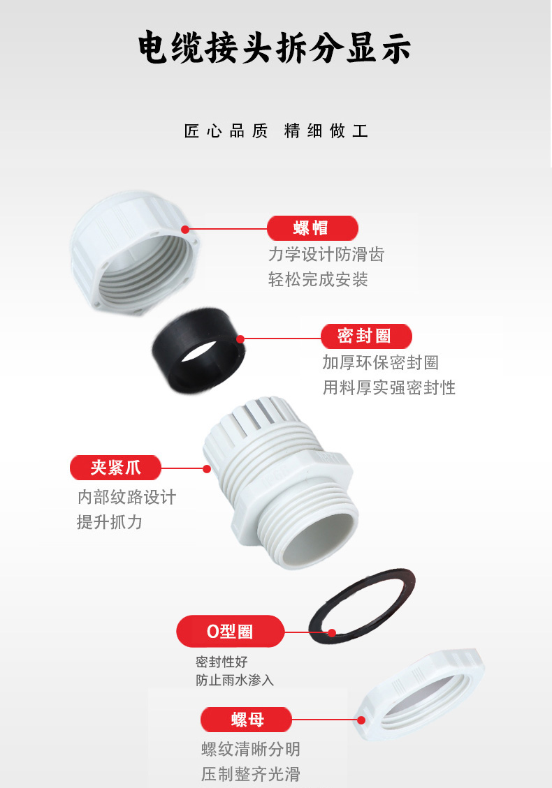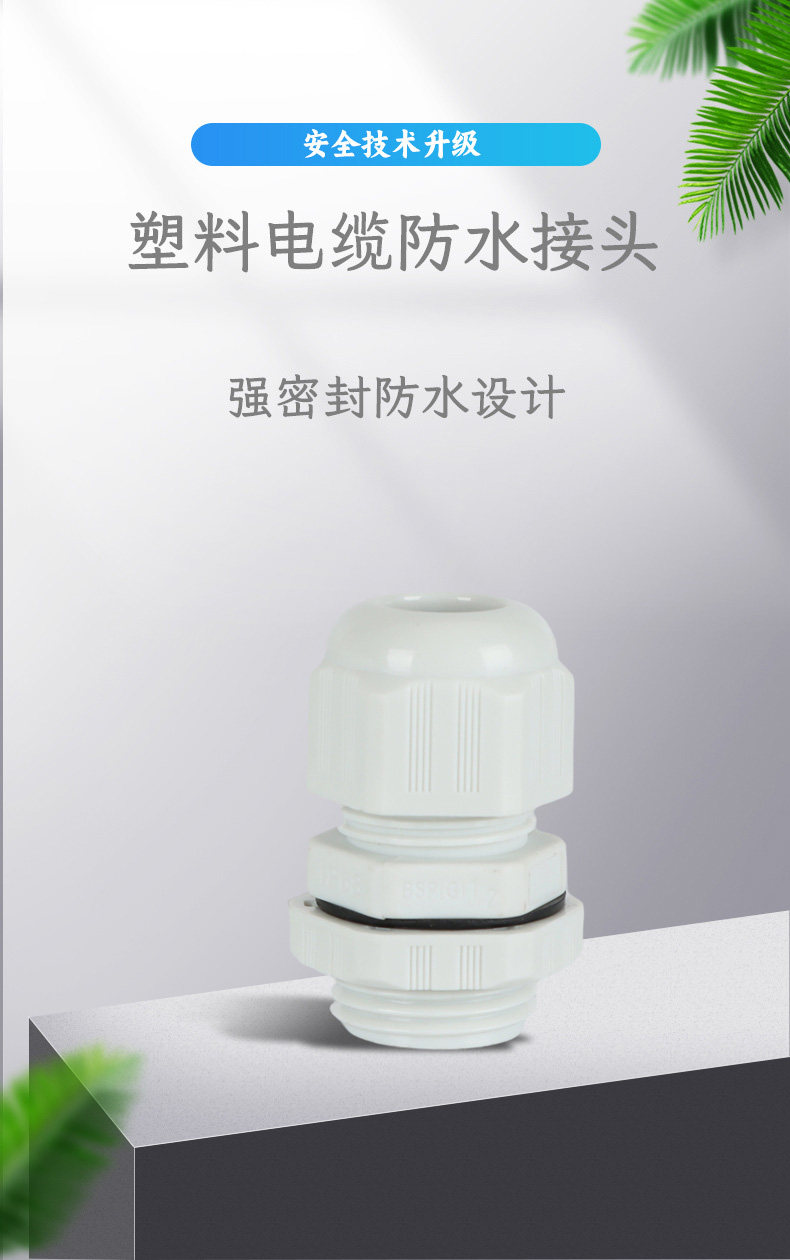 尼龍材質(zhì)適用惡劣環(huán)境紅、灰、黑、深灰、白、藍(lán) 六種顏色常規(guī):黑、灰兩種顏色,其它顏色需要定做在嚴(yán)寒與高溫等惡劣環(huán)境下,保持長期不開裂不漏水高密封性防水接頭保護(hù)電纜安全,長期使用不容易滲水