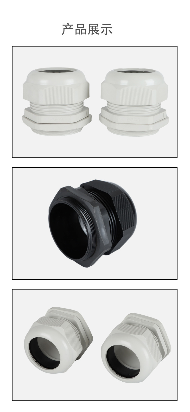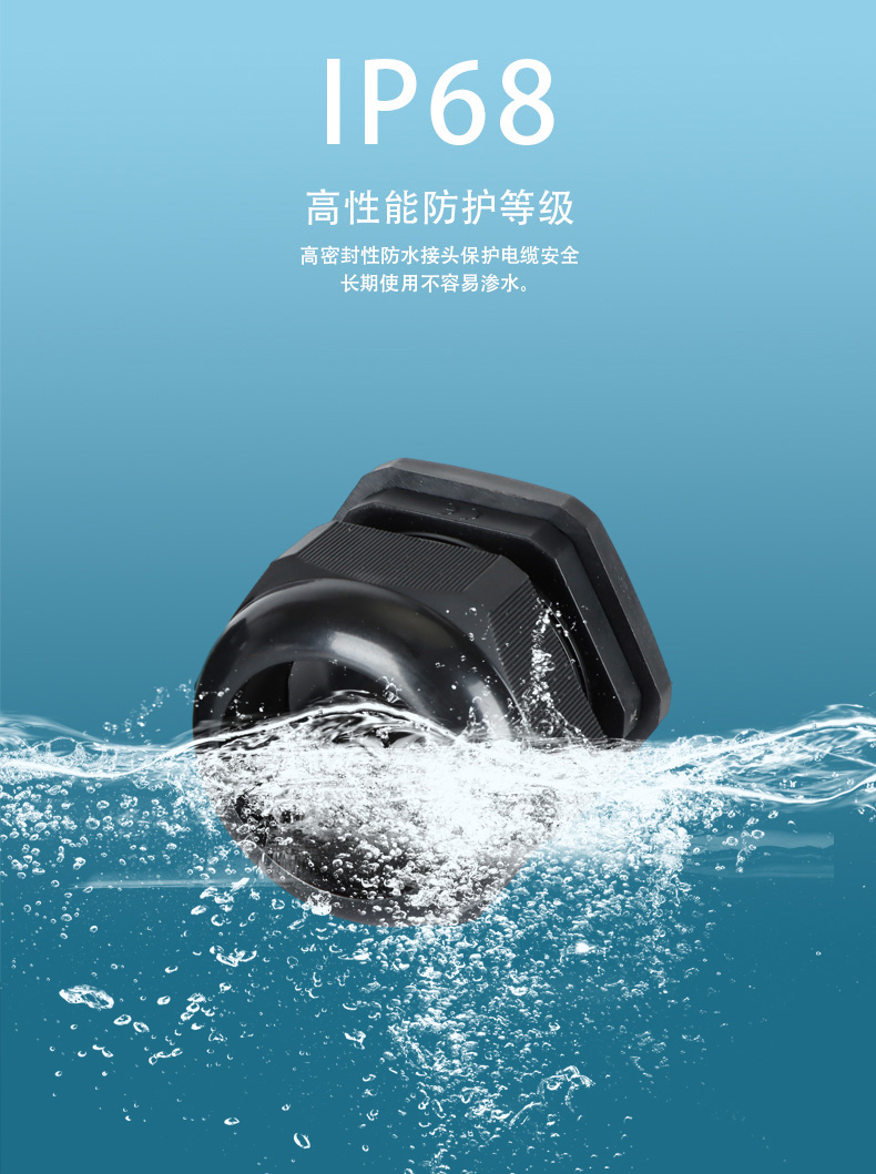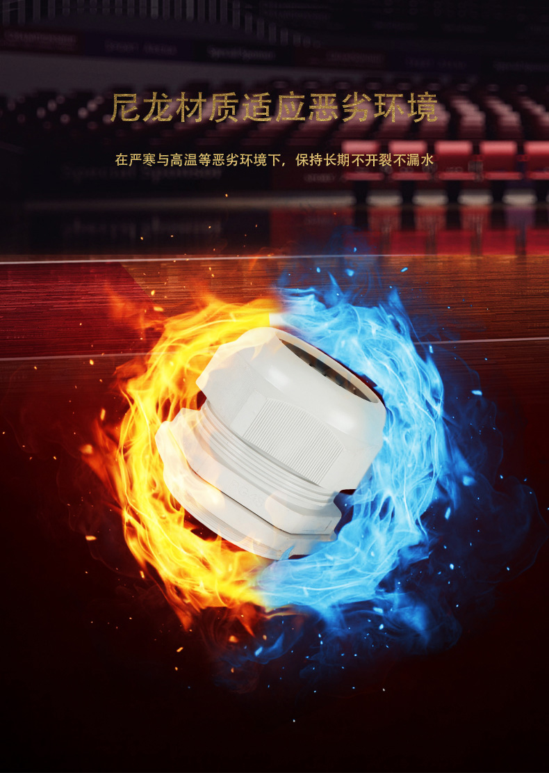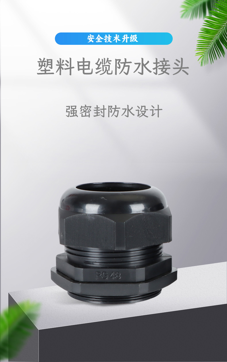 尼龍材質(zhì)適用惡劣環(huán)境紅、灰、黑、深灰、白、藍(lán) 六種顏色常規(guī):黑、灰兩種顏色,其它顏色需要定做在嚴(yán)寒與高溫等惡劣環(huán)境下,保持長期不開裂不漏水高密封性防水接頭保護(hù)電纜安全,長期使用不容易滲水