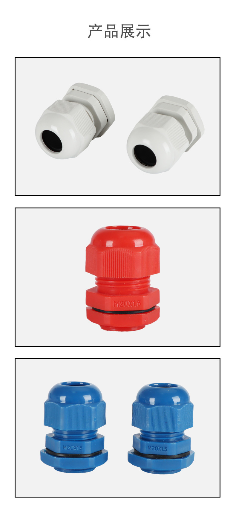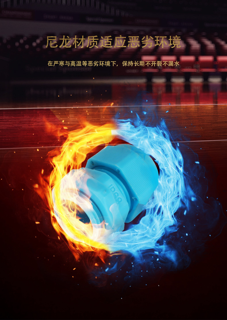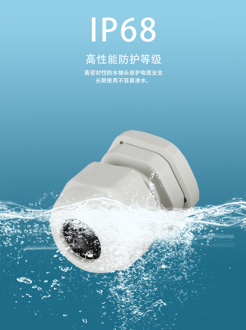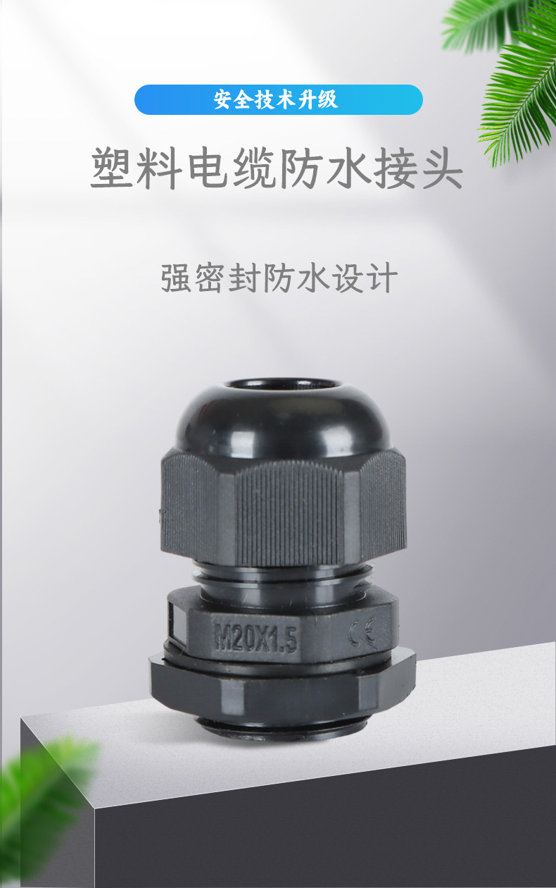 尼龍材質(zhì)適用惡劣環(huán)境紅、灰、黑、深灰、白、藍(lán) 六種顏色常規(guī):黑、灰兩種顏色,其它顏色需要定做在嚴(yán)寒與高溫等惡劣環(huán)境下,保持長期不開裂不漏水高密封性防水接頭保護(hù)電纜安全,長期使用不容易滲水