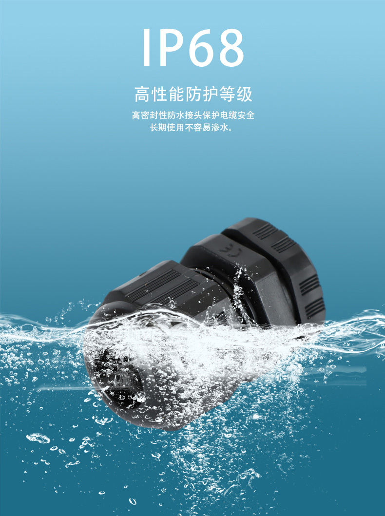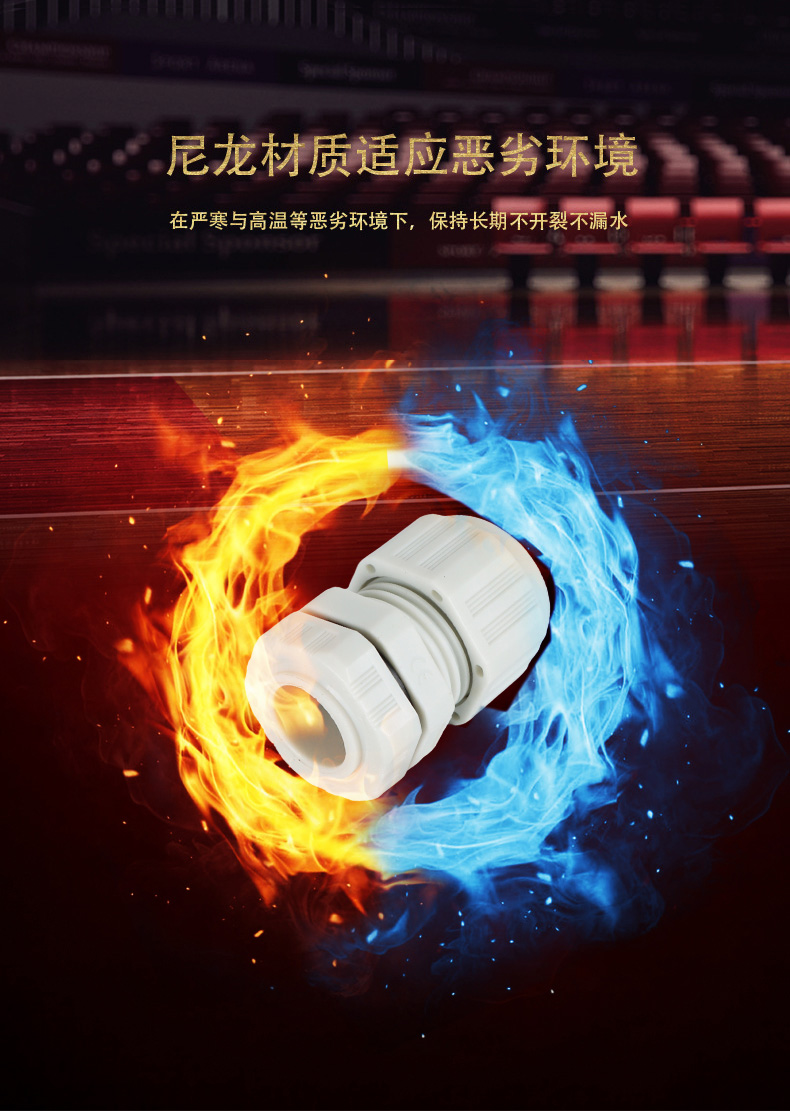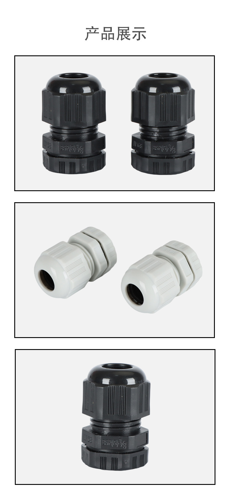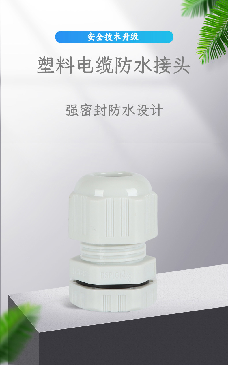 尼龍材質(zhì)適用惡劣環(huán)境紅、灰、黑、深灰、白、藍 六種顏色常規(guī):黑、灰兩種顏色,其它顏色需要定做在嚴(yán)寒與高溫等惡劣環(huán)境下,保持長期不開裂不漏水高密封性防水接頭保護電纜安全,長期使用不容易滲水
